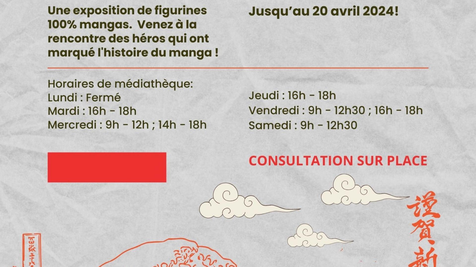La Médiathèque vous invite à venir découvrir une exposition de figurines des héros qui ont marqué l'histoire du manga jusqu'au 20 avril aux horaires habituels de la Médiathèque !